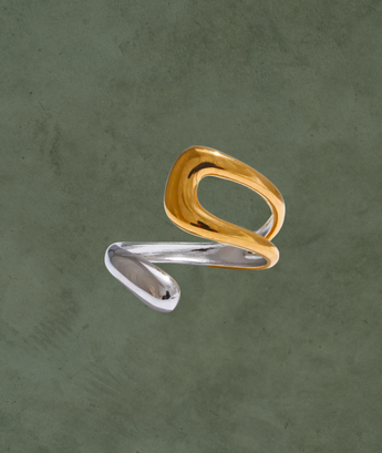 Una declaración de estilo en forma de anillo. Esta pieza de acero inoxidable combina dos tonos, plateado y dorado, en un diseño geométrico abierto que no pasa desapercibido. Su estructura hueca y líneas modernas lo convierten en una joya contemporánea, ideal para quienes aman destacar con elegancia.
