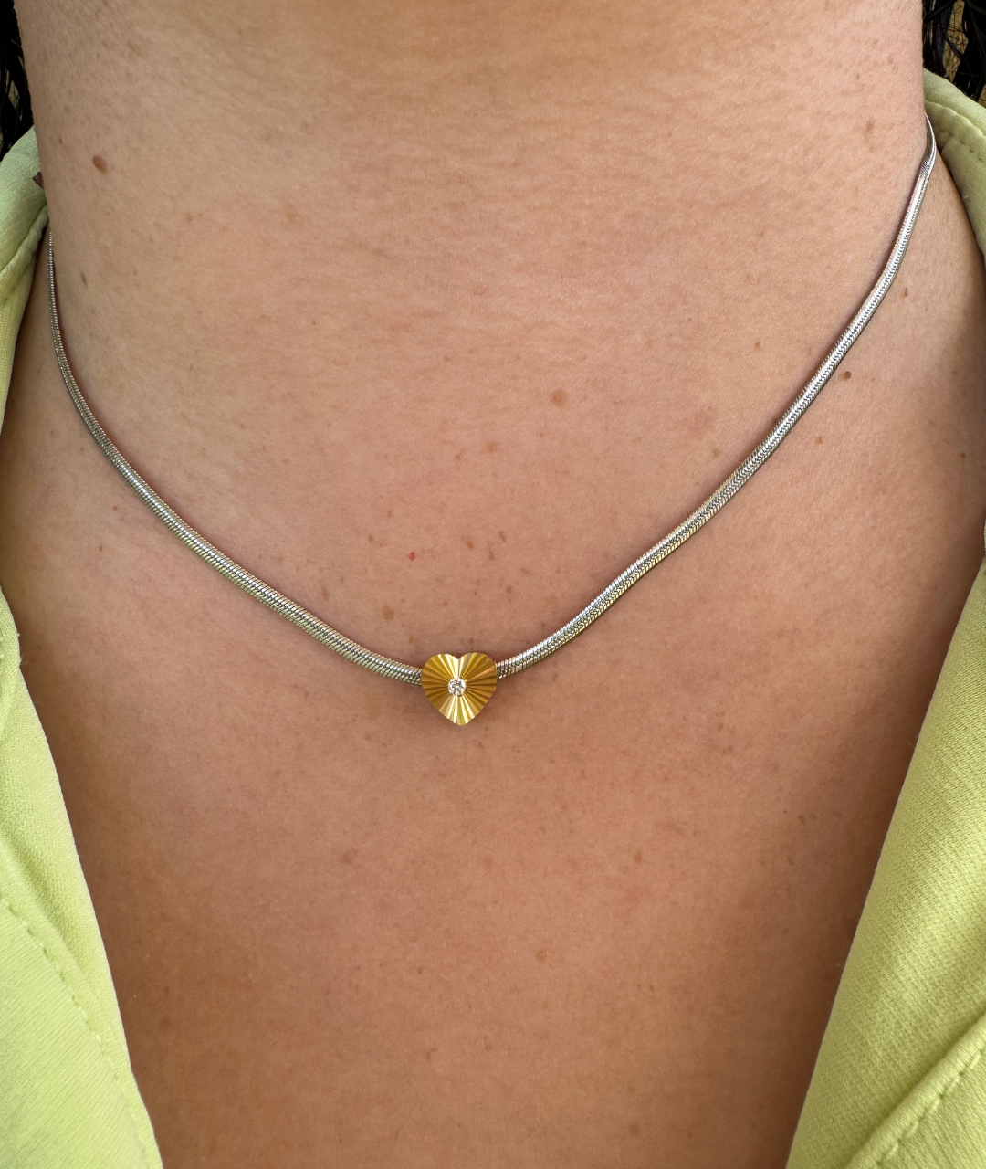 Elegante y con carácter, este collar con cadena tipo serpiente y dije de corazón con zirconia central es una pieza que destaca por su diseño moderno y sofisticado. El acabado pulido de la cadena aporta un efecto limpio y fluido, mientras que el corazón texturizado con brillo central añade un toque femenino y luminoso.
