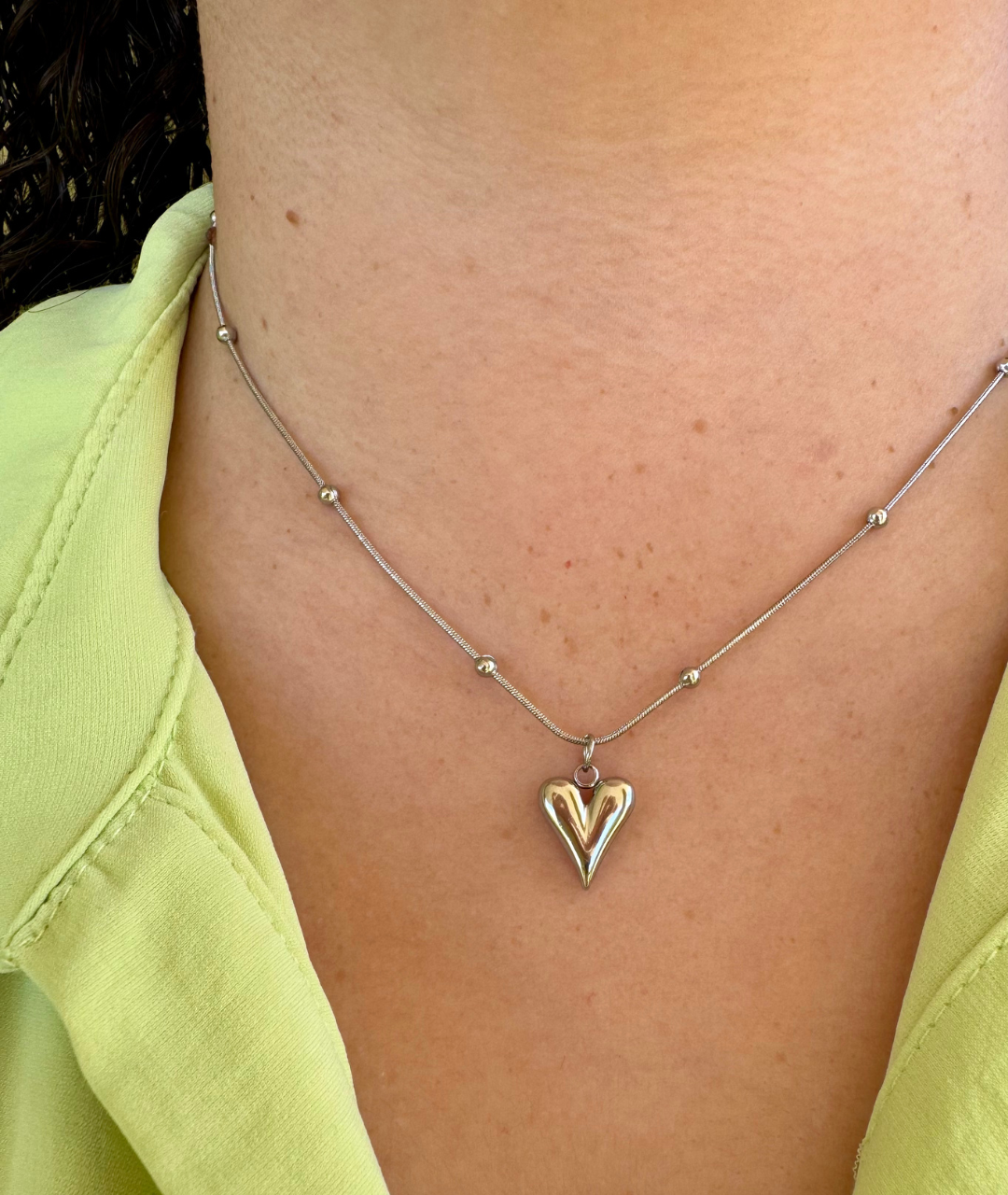 Minimalista y elegante, este collar con dije de corazón esculpido en tono plata es una pieza moderna que destaca por sus líneas limpias y diseño estilizado. Su acabado pulido aporta un aire contemporáneo y versátil, ideal para quienes prefieren accesorios sutiles con carácter.