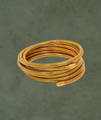 Un diseño que fusiona lo clásico con lo contemporáneo. Este brazalete dorado, elaborado en acero inoxidable y bañado en oro, se ajusta con naturalidad a tu muñeca gracias a su estructura elástica y multi-capa.