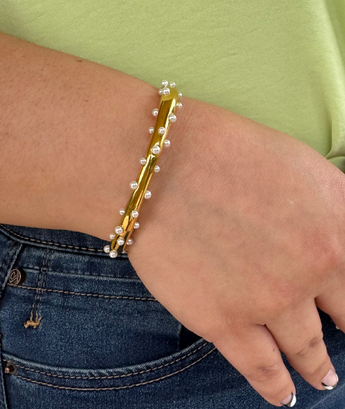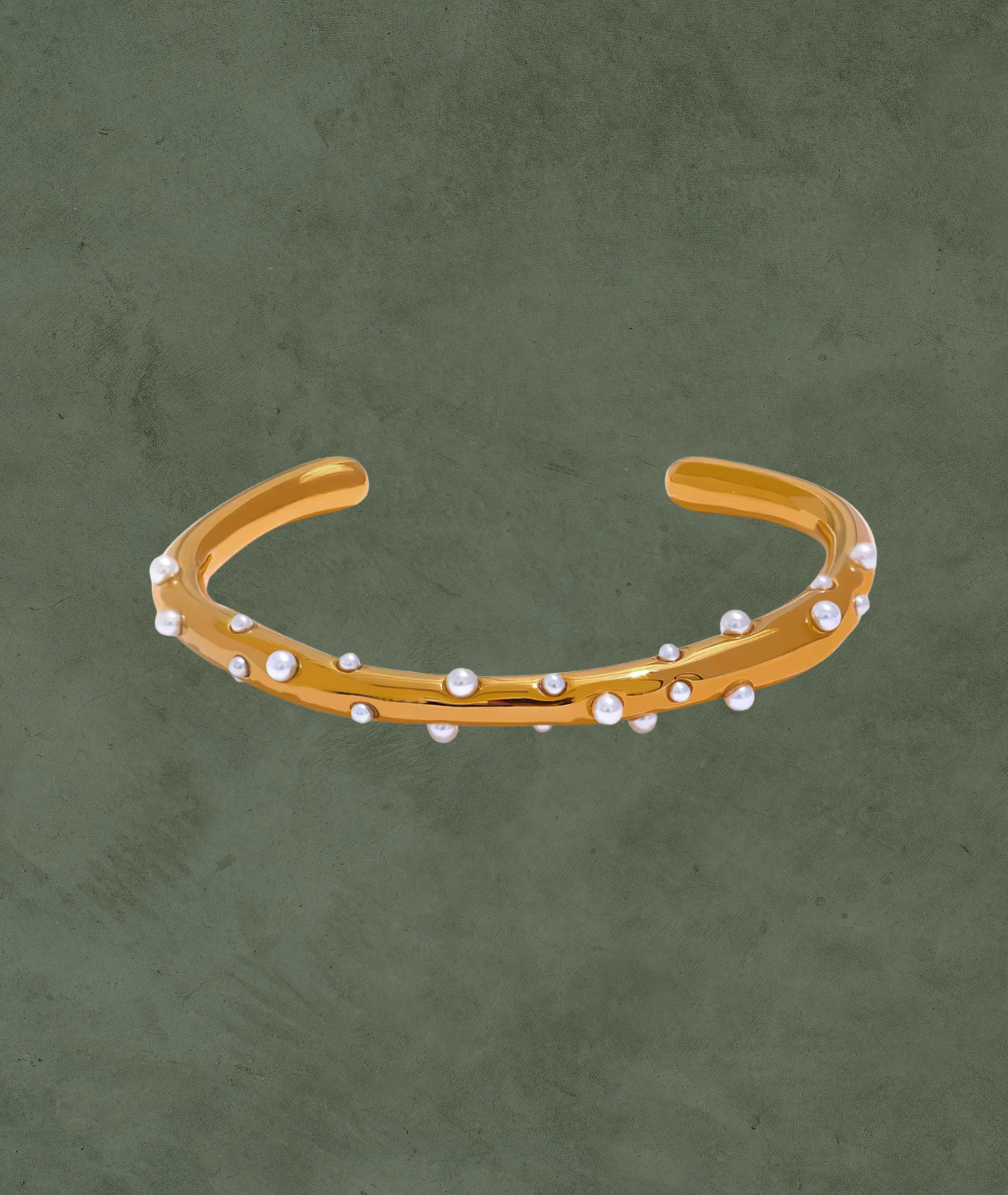 Una pieza que combina la delicadeza de las perlas con la fuerza del diseño moderno. Este brazalete abierto, confeccionado en acero inoxidable y bañado en tono dorado, destaca por su textura sutil y su diseño elegante que abraza la muñeca con naturalidad.