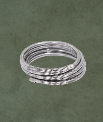 Este brazalete en tono plateado ofrece un estilo moderno y elegante en una sola pieza. Su diseño envolvente simula un juego de pulseras finas apiladas, logrando un efecto visual limpio y contemporáneo.