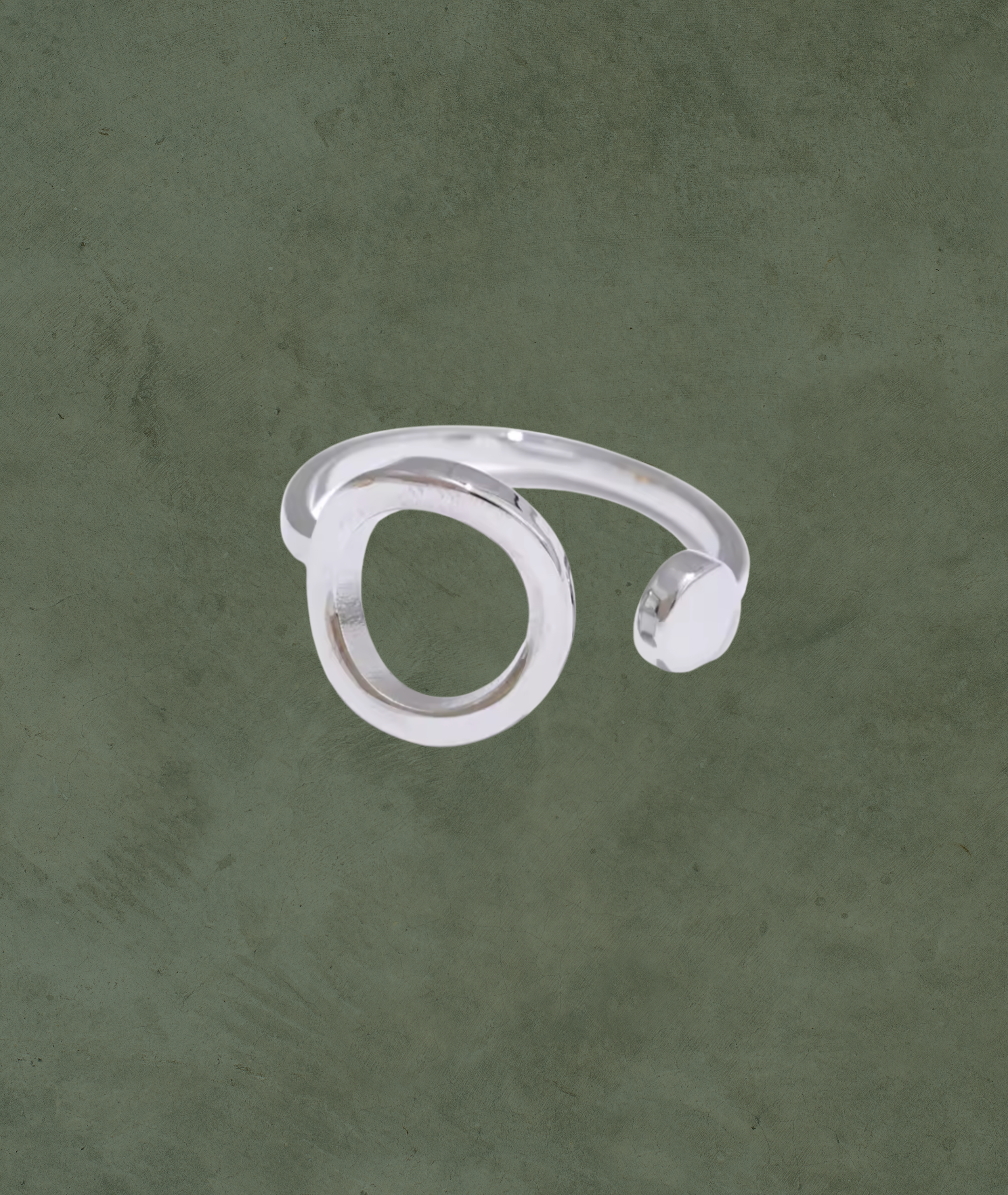 Este anillo en tono plateado destaca por su forma abierta y su silueta geométrica limpia que refleja modernidad y equilibrio. Fabricado en acero inoxidable de alta calidad, es resistente al agua y mantiene su brillo con el paso del tiempo.